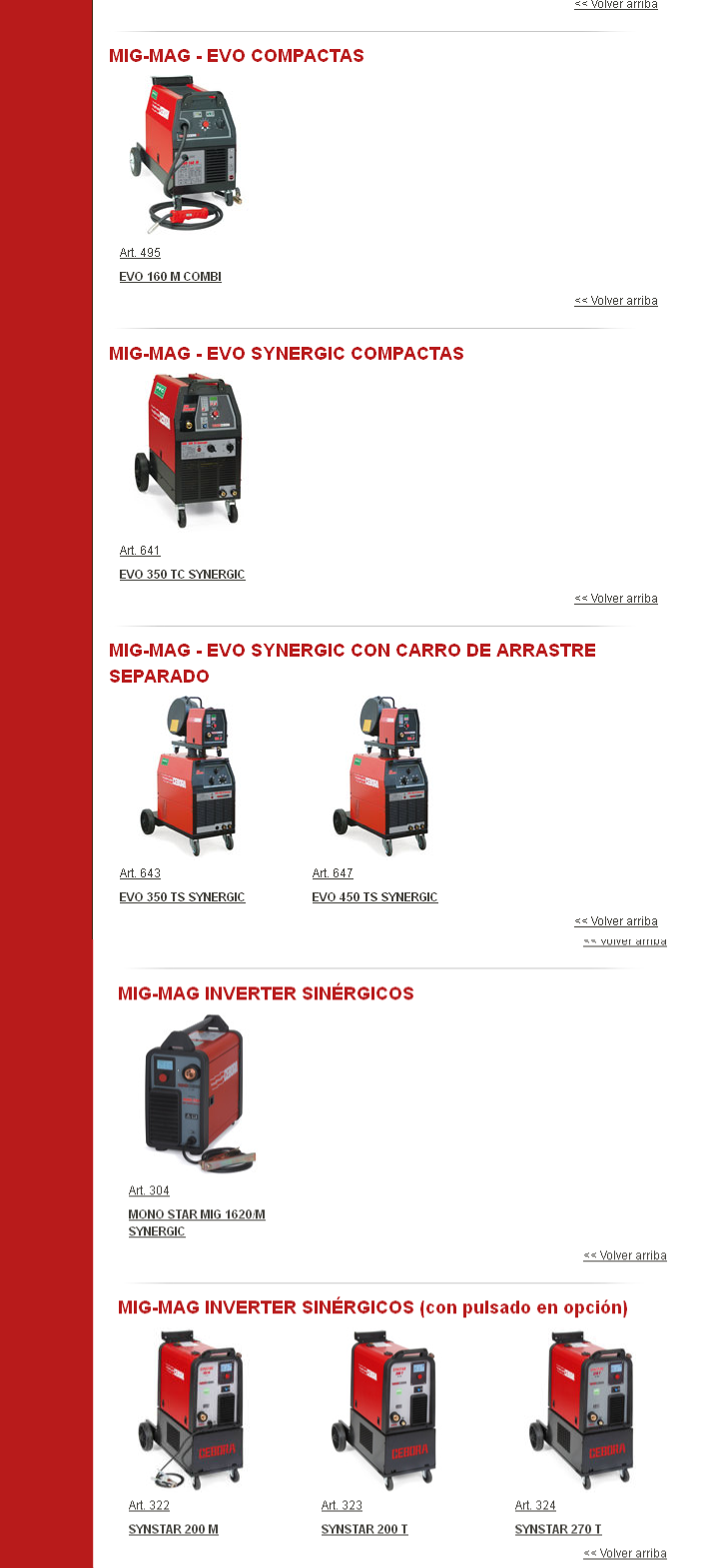 - MAG (GMAW) Generadors de soldadura MIG / MAG compactes o separades; electromecàniques electròniques, inverters, sinèrgiques, premudes. Àmplia gamma de potències, alimentació monofàsica o trifàsica. |